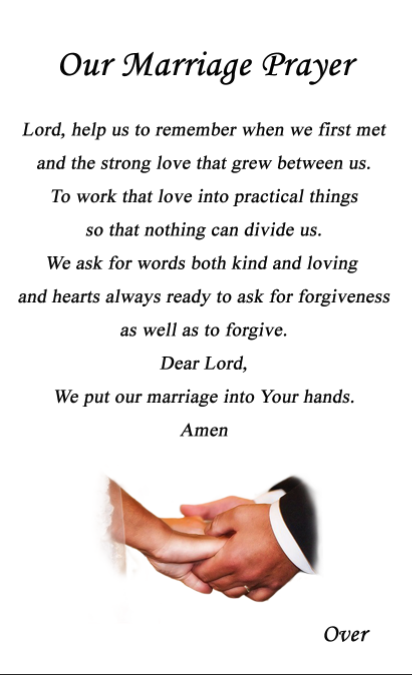 It is a beautiful prayer that reminds the couple what they must do every day to keep their marriage strong. Most importantly, it asks God to protect the marriage by placing it safely in His hands. Here is the front and back of the English Our Marriage Prayer card. They are approximately 3" x 5".